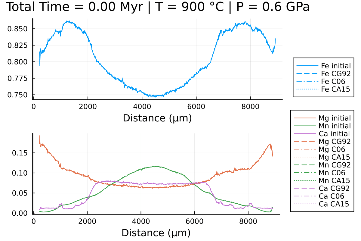 By default, DiffusionGarnet.jl uses the diffusion coefficients of Chakraborty & Ganguly (1992) to model garnet diffusion. However, it is possible to use other datasets: the one from Carlson (2006) and the one from Chu and Ague 2015. This tutorial will show how to use these different datasets in DiffusionGarnet.jl and we will compare them with a simple simulation.