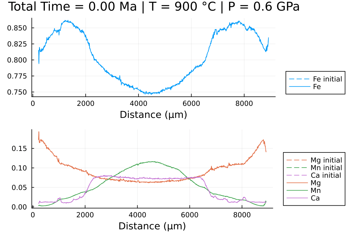 domain1D contains all the information that DiffusionGarnet needs to solve our coupled diffusion problem, at 900 °C and 0.6 GPa for a duration of 15 Myr.